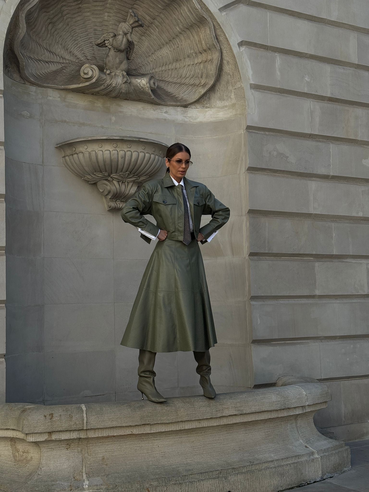 Nasza rozkloszowana spódnica wykonana jest z certyfikowanej włoskiej skóry, która zachwyca delikatną fakturą i naturalnym połyskiem. Dopracowany w każdym detalu krój Luizjany pięknie podkreśla talię, płynnie przechodząc w eleganckie rozkloszowanie, które dodaje sylwetce kobiecości i lekkości.